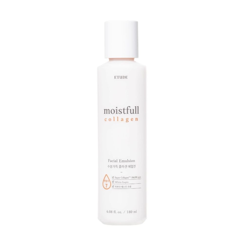 Az Etude Moistfull Collagen Emulsion egy könnyű, tej állagú hidratáló emulzió, amely 186 800 ppm Super Collagen™ Waterrel (hidrolizált kollagénnel) segíti a bőr mély és hosszan tartó hidratálását. A finom molekulájú kollagén gyorsan behatol a bőrbe, támogatja annak rugalmasságát és teltségét, miközben bársonyos, komfortos érzetet hagy maga után. A formulát Lupinus Albus (fehér csillagfürt) fehérje egészíti ki, amely különösen hatékony a száraz, vízhiányos bőr revitalizálásában: segít a bőr megújulásában és egészséges, üde megjelenést kölcsönöz. Az emulzió ideális átmenet a toner és a krém között, önmagában is használható, vagy hidratáló krém alá rétegezve.